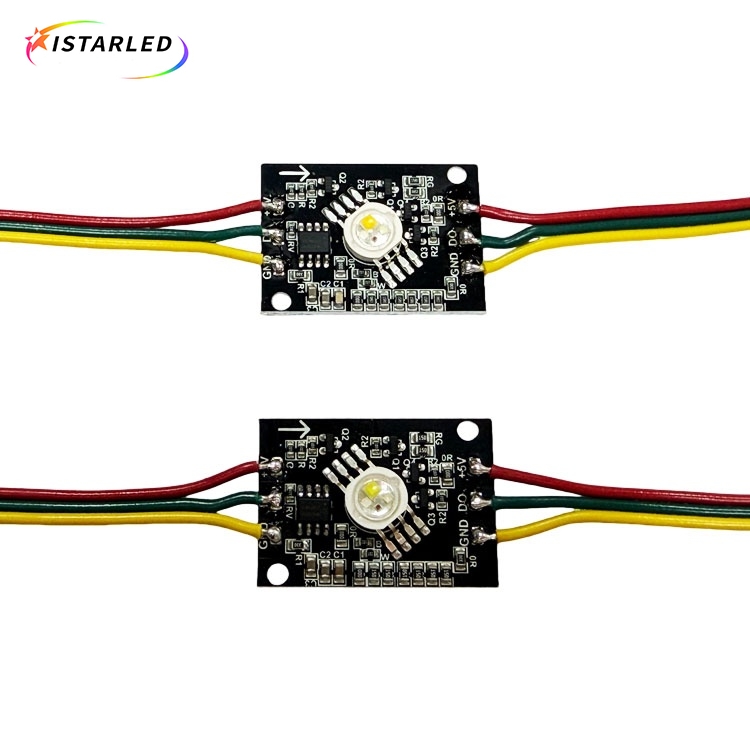High power digital rgbw 4w led module use RGBW Warm white with 140 degree beam,which are connected by a 3 color cable,that is DC5V+,DATA and GND,of course,extra power cable for each chain.Supper bright 4w rgbw spi pixel led module is made by single piece,each pcs with 3PIN JST SM female and male connectors, male connectors as input,female connectors as output as normal one, of course can do customer cables.