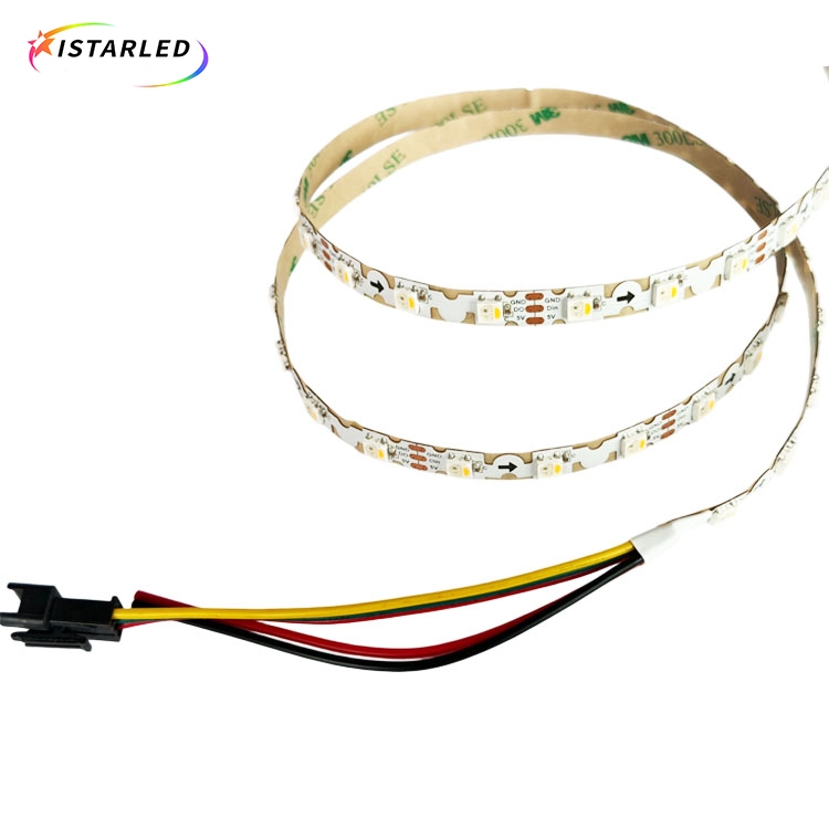 And those strip is flexible pcb with 60 pcs addressable leds but with 3leds have solder pads, that is, you can cut every 3leds to match for your projects.Normal we do is 5m per roll, and each roll with 3Pin JST SM female and male connectors.Female connectors with input, male connectors with output.Of course, we also can do customer length per roll and connectors,such as molex connectors,waterproof connectors.Each roll is with 2 extra power cable(this strip is dc5v to input power,so please don't use higher than 6V or you can destroy the entire strip.